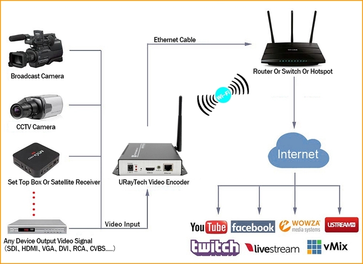 This video encoder is a HD audio and video encoding device with powerful functionality. It supports HDMI(audio build-in) and external stereo audio(3.5mm) input, H.265 /H.264 video encoding and AAC /MP3 /G.711 audio encoding, 2 video streams output simultaneously. It supports HTTP, RTSP, UDP, RTP, Multicast, Unitcast, RTMP, ONVIF, HLS(M3U8), FLV, RTMPS etc streaming protocol. Its high integration and cost-effective design make this device widely used in variety of field such as CATV digital head-end, hotel IPTV system, live streaming broadcast, streaming media server etc. Also the encoder works with online live broadcast platforms, such as YouTube Live, Ustream, Twitch, Facebook Live etc.